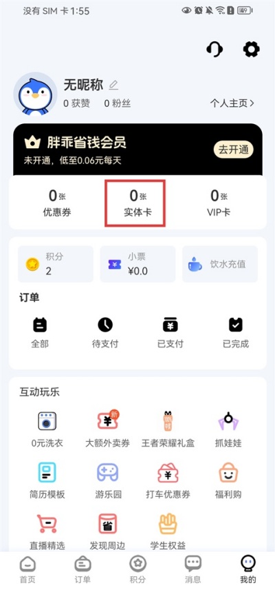 1、打开胖乖生活App进入【我的】页面,在功能列表中点击【实体卡】选项,进入卡包与绑定管理界面。