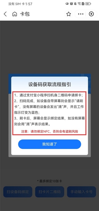 2、在卡包页面点击【扫设备码绑定】按钮,系统将自动跳转至支付宝页面并展示绑卡流程说明。