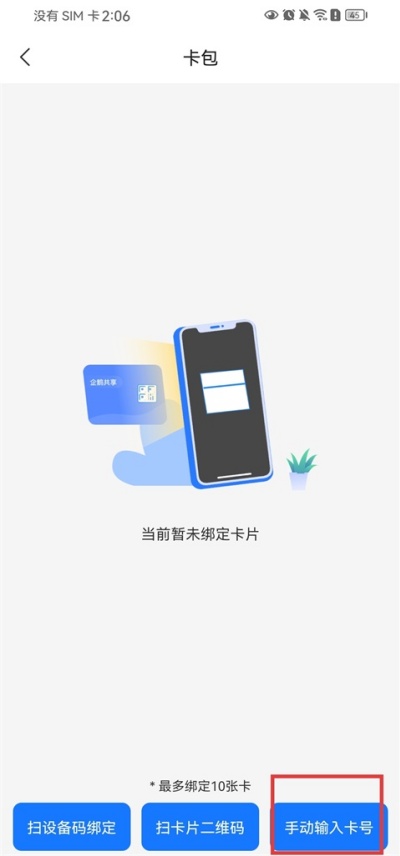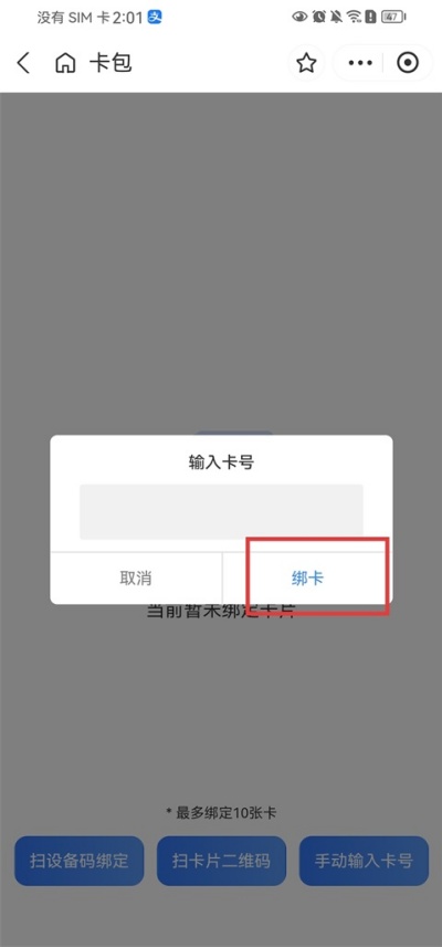 4、如扫码绑定不成功,可选择【手动输入卡号】方式,直接填写实体卡号信息完成绑定操作。