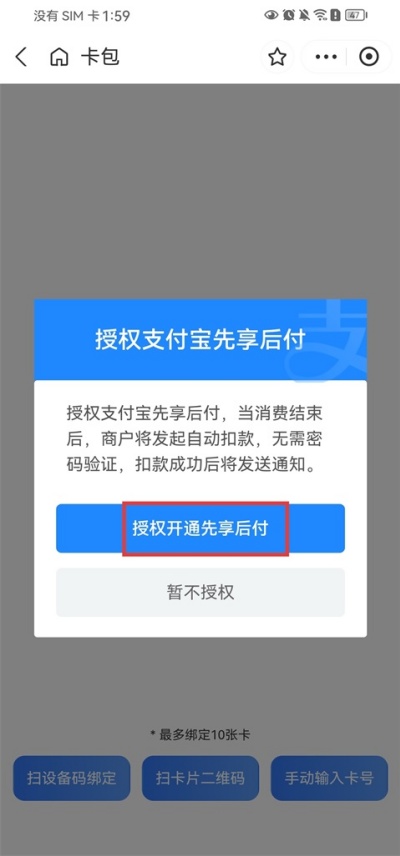 6、按照提示完成先享后付服务授权开通操作,为后续实体卡绑定使用提供支付权限支持。