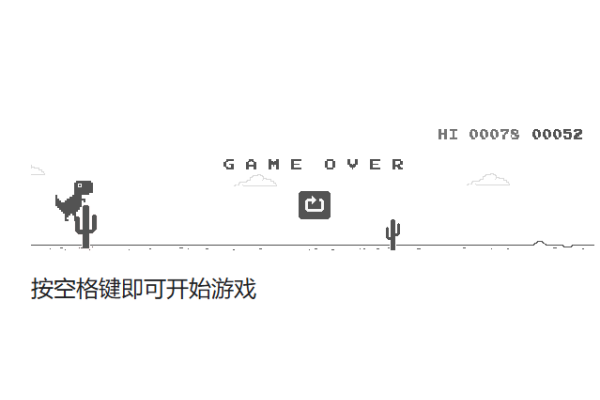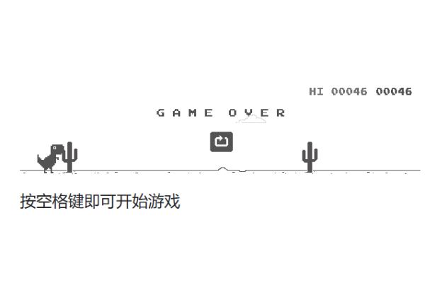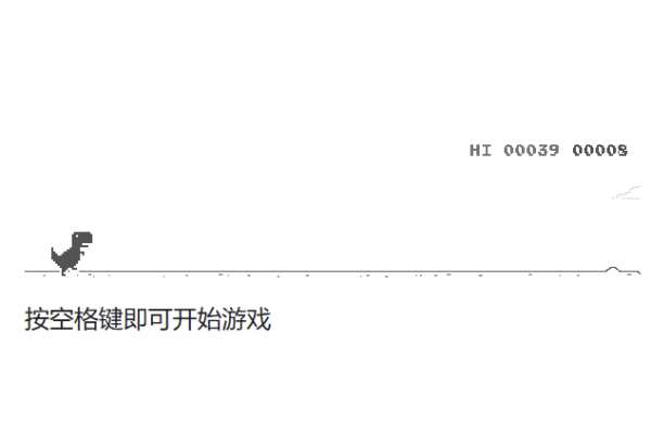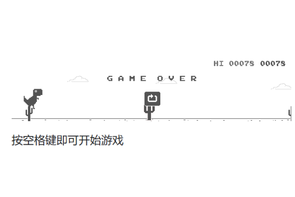 1、断网状态下打开Chrome浏览器访问任意网址,或直接在地址栏输入chrome://dino/,按空格/上键或点击小恐龙启动游戏。