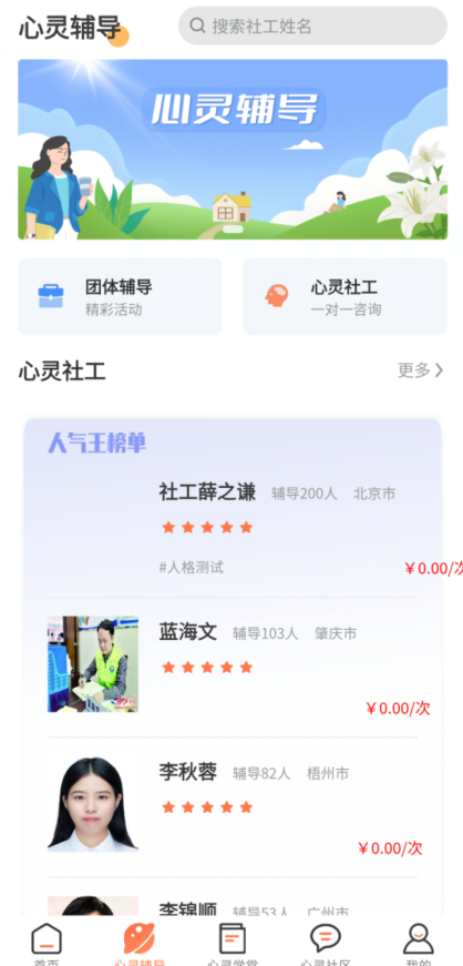 1、进入心灵辅导界面后,可以浏览并选择你想要咨询的专业人员。