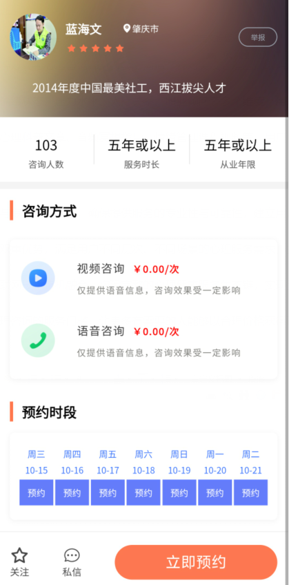 2、查看对方的详细资料,根据可用时间选择合适的时段进行预约。