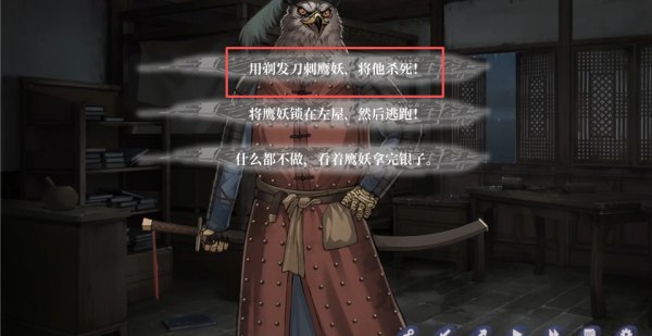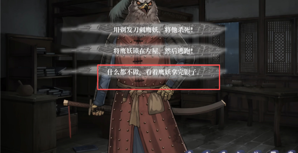 3、结局:死于狼妖。选择【选择观望,不做任何行动,任由鹰妖取走银两】。
