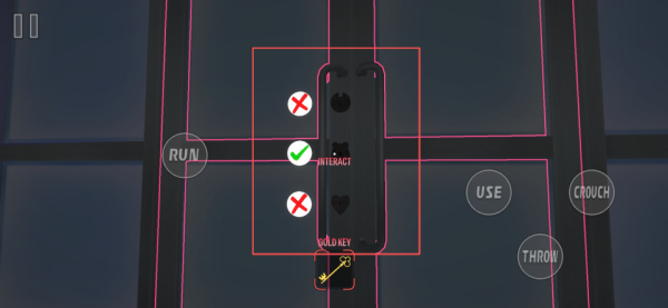 2、进入场景后使用左下角虚拟摇杆控制移动,左侧【Run】用于加速奔跑,右侧设有【Use】互动、【Crouch】下蹲与【Throw】投掷功能。