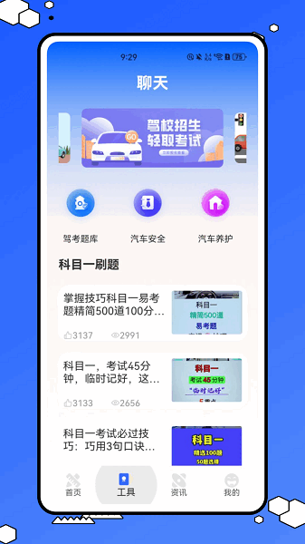 驾考学员的通关智库!首页直击科一至科四全科目考点,工具页集成海量题库、汽车养护秘籍及专项刷题模式。更有实时汽车资讯、安全知识科普,备考干货与用车技巧双赋能,助您高效刷题、安心驾考,轻松进阶老司机!