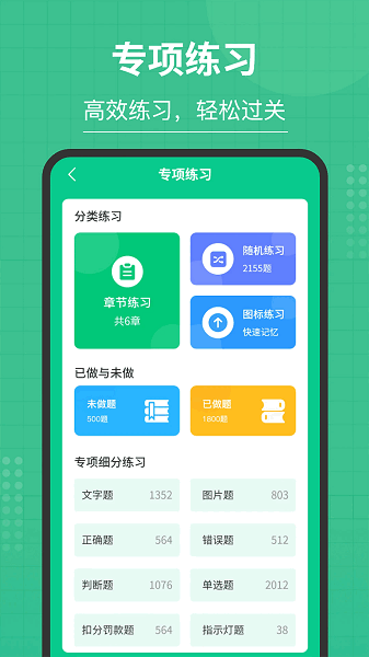 针对驾考难点、易错点,设置专项练习模块,帮助您逐一攻克,强化记忆,确保每个知识点都能熟练掌握。