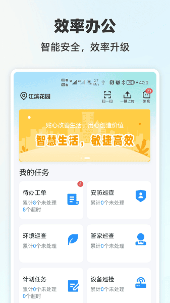 悦服务plusapp给物业工作人员带来更好的办公体验,在线就能通过软件了解各类工单也能与业主用户线上沟通,为业主进行服务,分配任务以及查看工作信息都非常方便!