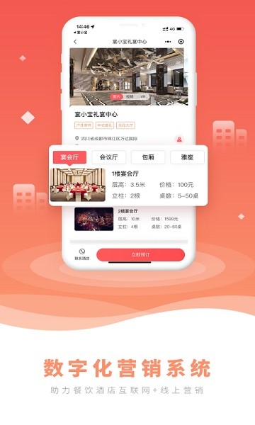 餐饮宴会酒店+一站式婚礼堂专业数字化营销运营管理系统;集成了CRM客户管理、智能跟进提醒、宴会订餐本、场地管理、场地档期管理、商家独立小程序、演职人员资源管理、订单管理、合同管理、销售数据分析、运营数据分析等为一体的一站式宴会系统。随时随地管理宴会厅、会议厅、包厢及雅间,记录客户预定信息,包括锁定的日期、餐厅、预付定金、桌数及其他信息。