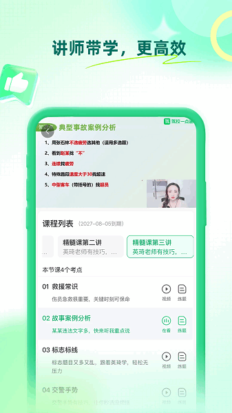 驾校一点通同步驾考科目一、科目四新题库,对题库覆盖的知识点进行了详细分类。同时,上线涵盖科目一、科目二、科目三和科目四的线上课程,方便学员系统性、全面性的学习,切实帮助学员提高成绩顺利通过考试拿到驾驶证。