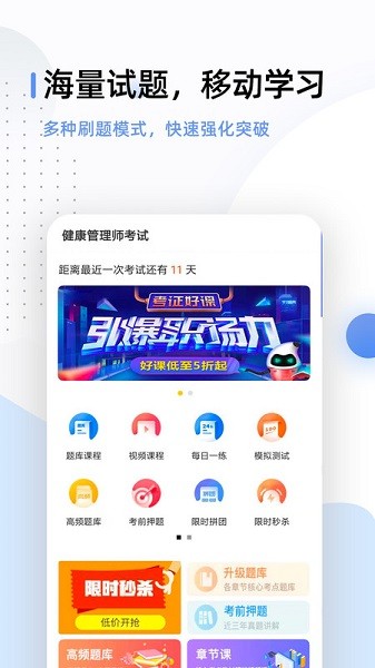 健康管理师考试题库app提供了一站式的备考服务,专业老师根据你的情况定制学习方案,海量的题型数据,你可以尽情刷题,海量视频专业讲解,让你了解所有知识点。