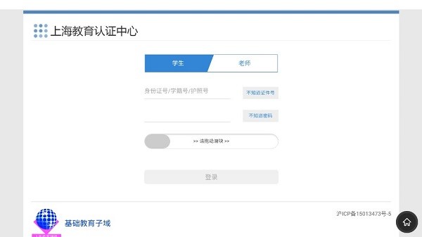 (2)使用“上海市基础教育统一身份认证”登录:选择学生/教师身份,输入个人账号(教师是师训号,学生是身份证号),默认密码是SHedu@身份证号后六位。