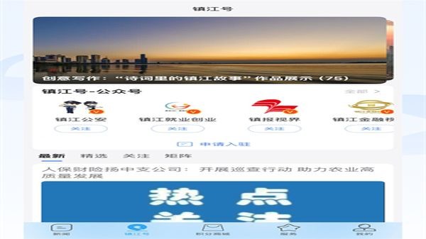 1、打开今日镇江应用,点击底部导航栏的新闻选项,进入首页查看推荐的各类资讯和功能入口。