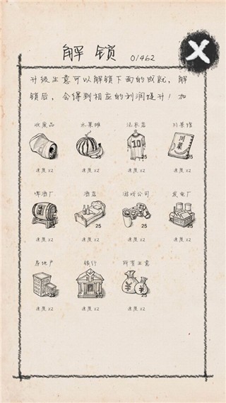 游戏每个项目达到20,50,100,3200,300,400,500.....数量以后即可加倍赚钱速度。