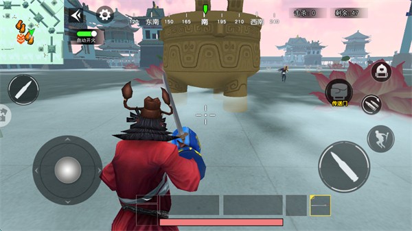 1、开始游戏后,左侧摇杆操控角色移动,在中式古建战场中探索,开启自动按键准备战斗。