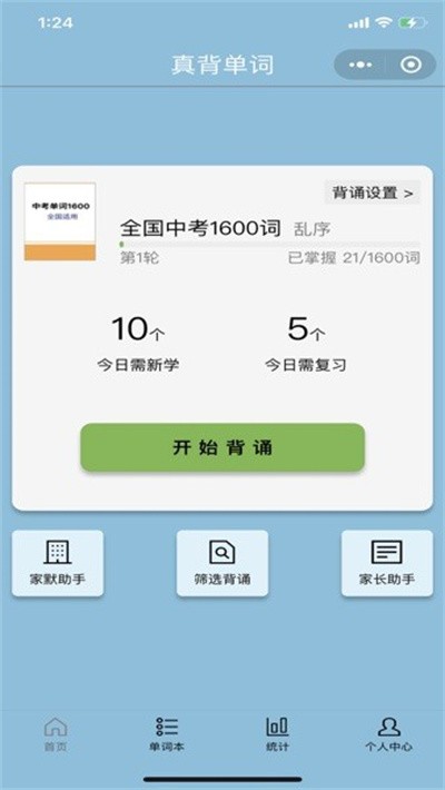2、回到主界面,可查看所选词书的学习进度,点击开始背诵进入学习,也可使用家默助手家长监督等功能。