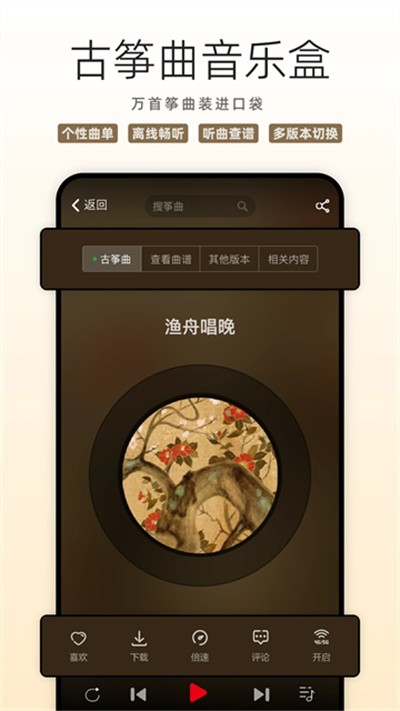 搭载海量古筝音频与专属电台栏目,支持创建个人曲单,曲目可下载离线播放,满足日常聆听与磨耳需求。
