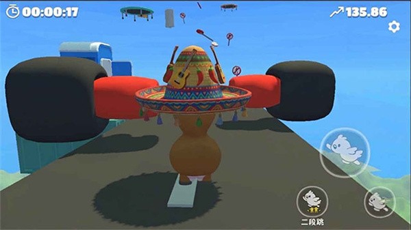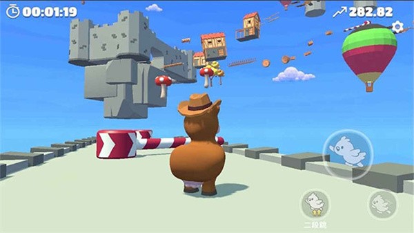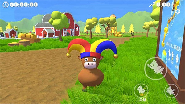 3、进入农场主场景,操控棕色小牛前进,界面显示计时和分数统计,右侧有跳跃按钮,底部展示强力蹦床等道具,可借助道具跳跃闯关。