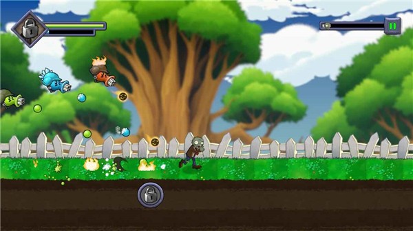 1、操控僵尸角色向前奔跑,躲避空中发射的各类子弹,同时避开地面的火焰等陷阱,安全向前推进。