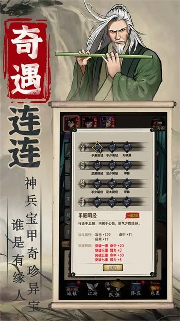 内功心法通过实战与打坐缓慢提升熟练度,突破至新的武学境界时会触发专属的心魔试炼,成功后方能领悟更强招式。