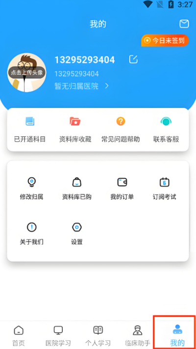 1、在医考拉app底部导航栏中找到并点击“我的”入口,进入个人中心页面。