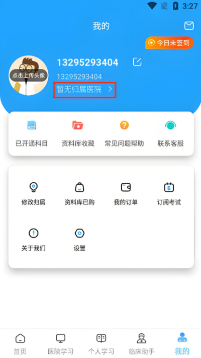 2、在个人信息区域点击“暂无归属医院”选项,进入机构绑定设置界面。