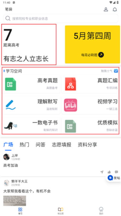 1、打开笔袋app后进入首页界面,在功能入口中找到并点击“高考真题”模块。