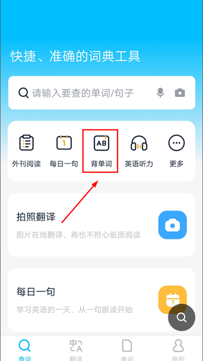 1、打开金山词霸app后在首页进入“背单词”功能入口,进入词汇学习模块。