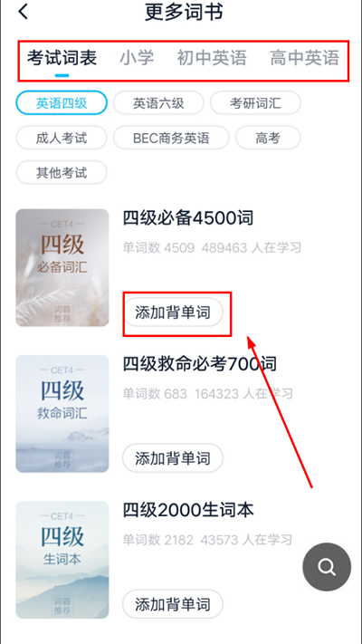 2、在“更多词书”页面中根据学习需求选择合适词汇量与词书内容进行学习。