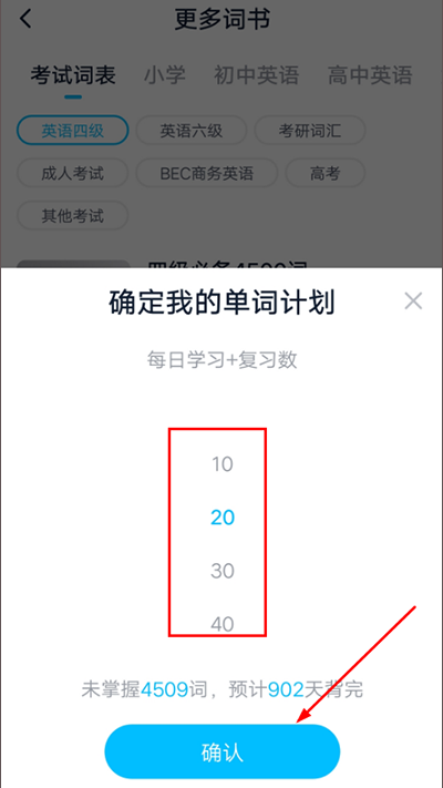 3、完成词书选择后设置每日学习计划,包括新词学习数量与复习安排。