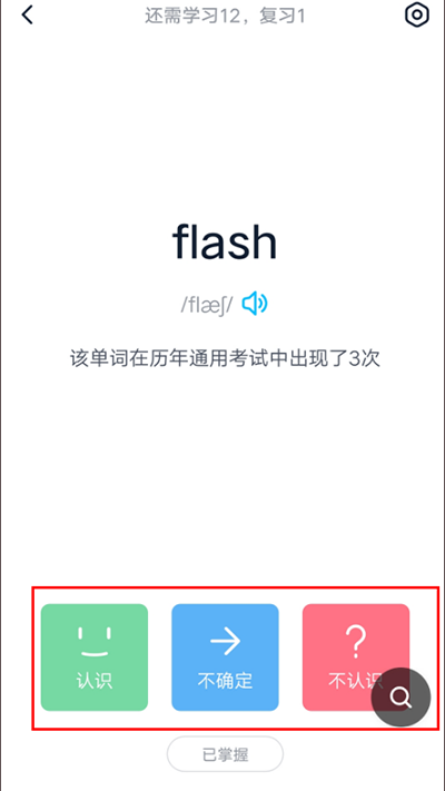 5、学习过程中根据词汇掌握情况进行反馈选择,包括“认识”“不确定”“不认识”三种状态记录。