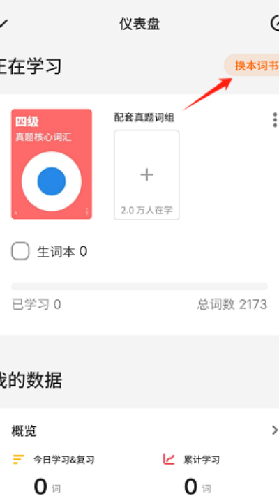 2、进入仪表盘页面后,在右上角位置找到并点击“换本词书”选项进入词书切换界面。