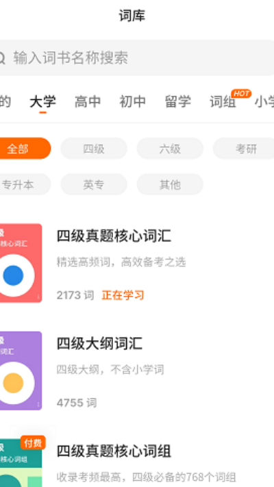 3、在词书库中浏览可用单词书列表,根据学习需求选择目标词书内容。