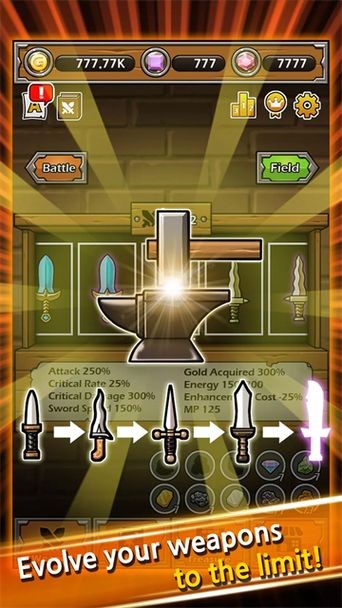 最强名剑是一款怀旧风格的放置手游,以剑士踏上寻求极致剑艺的旅程。在于收集各类素材打造并不断锤炼自己的名剑,各种战斗与冒险模式获取锻造所需的资源。整个战斗过程简洁流畅自动进行可通过点击主动出击加快节奏,成功击败敌人将收获魔法石宝石金币等多样奖励。利用这些奖励强化你的剑,提升其攻击力暴击属性以及移动速度等各方面能力。