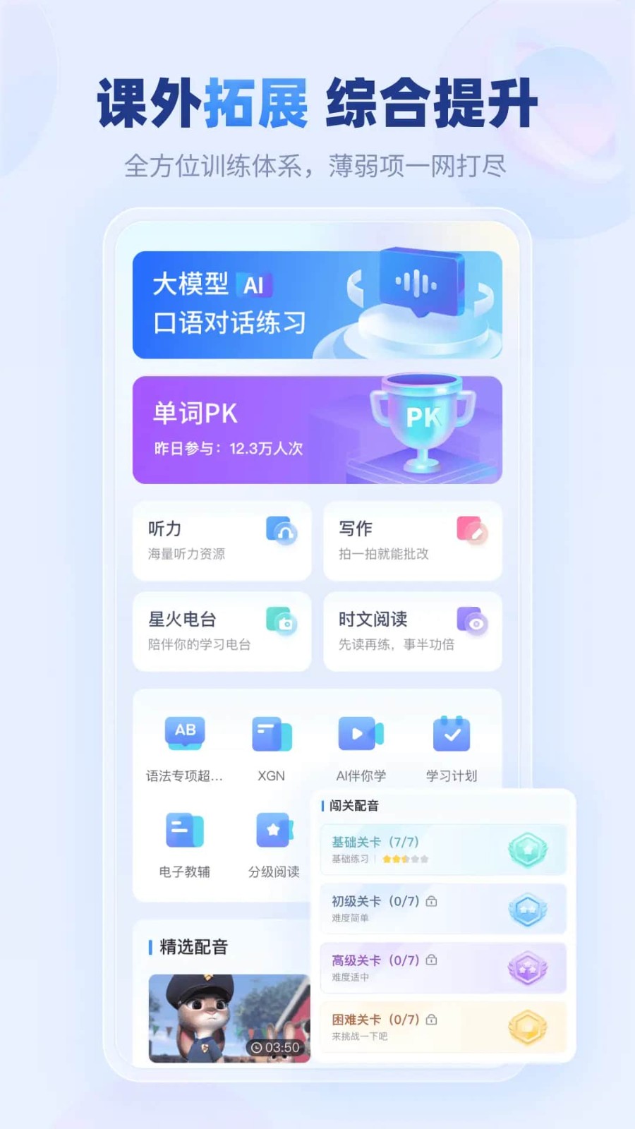 涵盖音标学习、课文朗读、跟读等核心功能,音标学习采用闯关式趣味设计,课文练习同步教材进度,智能评分评测,帮助学生夯实英语基础、规范发音。
