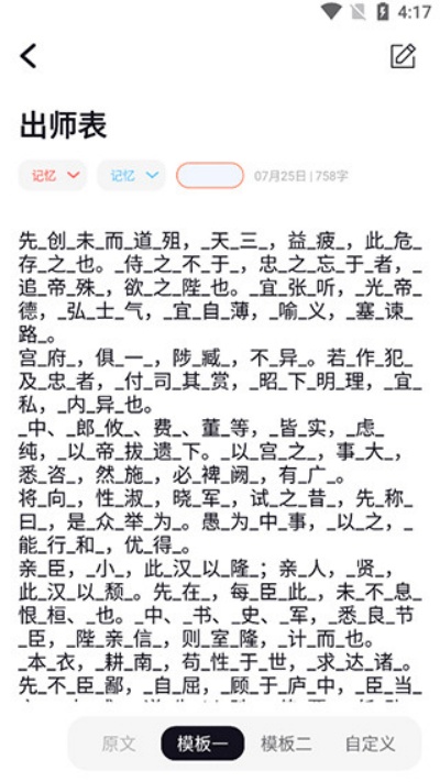 2、完成保存后再次打开文章,系统会对部分内容进行自动隐藏处理,便于进行训练。