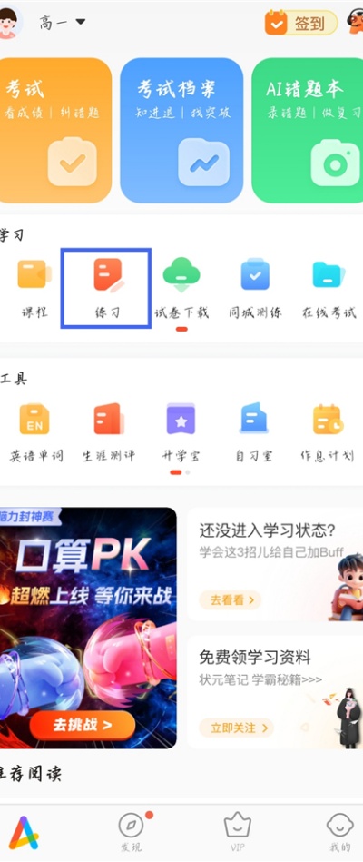 1、进入好分数学生版应用后,在首页功能区选择【练习】入口,进入相关练习与学习任务管理页面。