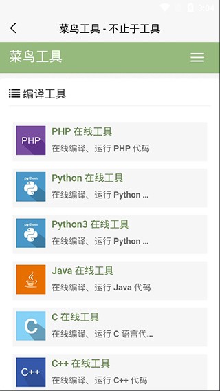 4、菜鸟工具:在软件内可直接进入“菜鸟工具”模块,使用多种在线辅助工具完成代码测试与学习操作。