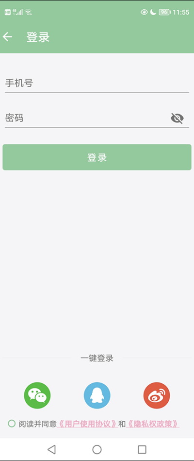 2、在登录界面中勾选同意《用户使用协议与隐私政策》,随后选择微信、qq或微博等方式完成快捷登录操作。