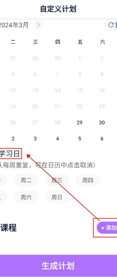 4、若选择智能定制模式,系统将依据课程自动生成学习计划;若选择自定义模式,则需设置学习日期与学习日,并添加课程内容后点击生成完成创建。