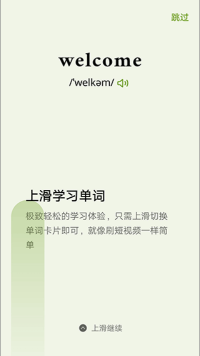 1、采用卡片式学习模式,上滑即可切换单词内容,操作方式类似短视频浏览,学习过程更加轻松直观。