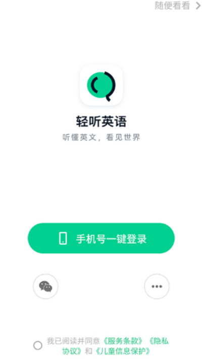 1、打开轻听英语app后进入初始界面,根据提示选择年龄信息,并可选择登录账号或以游客身份进入使用。