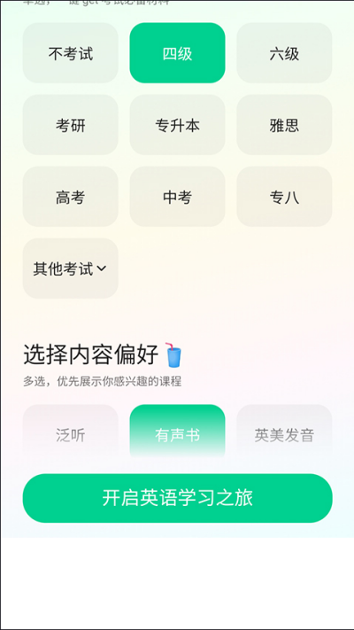 2、完成登录后进入学习引导页面,根据个人偏好选择学习类型,系统将据此推荐相应学习内容。
