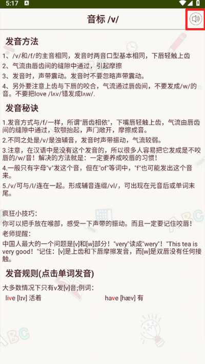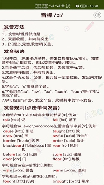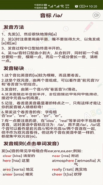 2、在音标详情界面中学习发音规则,并通过音频收听标准示范发音进行模仿。