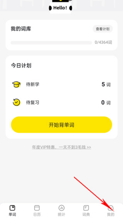 1、打开疯狂背单词app并完成登录进入首页,在底部导航中点击“我的”进入个人页面。