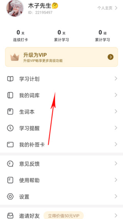 2、在个人页面中找到并点击“我的词库”功能入口,进入词库管理界面。
