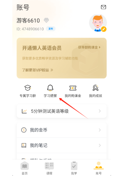 2、登录成功后,进入“账号”页面,可进行个性化设置,包括绑定手机号、开启学习提醒等。