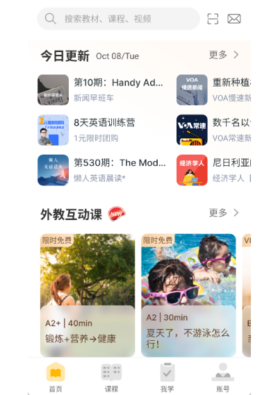 3、返回首页,根据自身兴趣与学习需求,选择美剧、新闻、口语等适配的学习资源,开启学习。