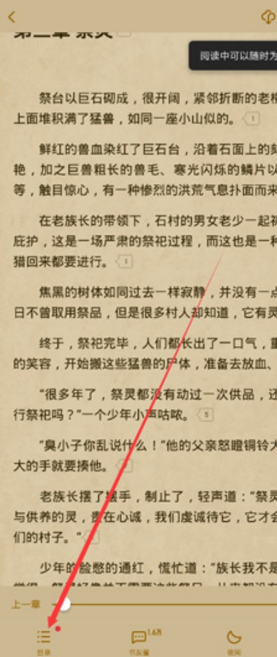 4、阅读过程中如需切换章节,可点击屏幕任意位置调出功能菜单,并选择左下角“目录”快速跳转章节。