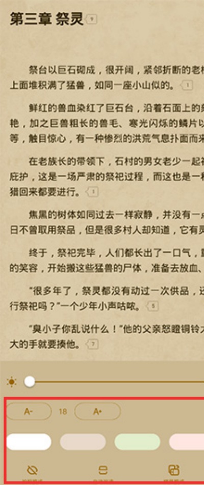 5、在阅读界面底部点击“设置”功能,可根据需求调整护眼模式、自动阅读、横屏模式以及字体大小等阅读参数。
